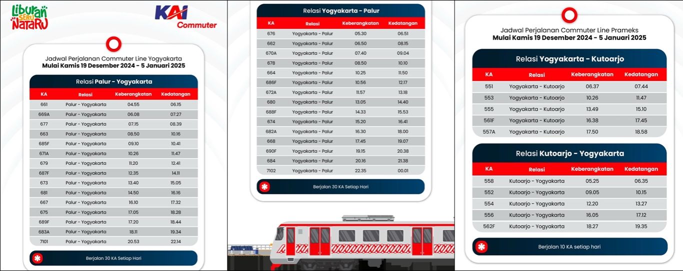 “Pada masa Nataru ini, KAI Commuter memetakan kebutuhan masyarakat yang mengisi liburan, dan menambah perjalanan Commuter Line di Wilayah 6 Yogyakarta. Agar kebutuhan transportasi warga yang berlibur dapat terpenuhi secara maksimal,” VP Corporate Secretary KAI Commuter Joni Martinus, menerangkan.