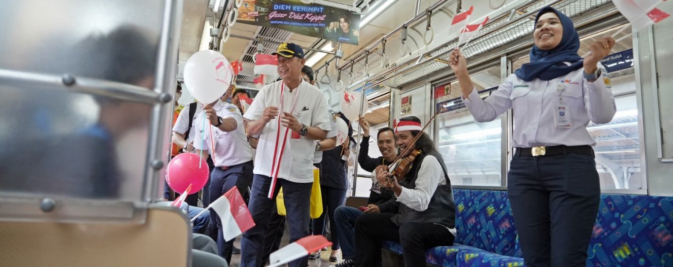 Jakarta - KAI Commuter meriahkan Hari Kemerdekaan RI ke-79 dengan melakukan pembagian bendera merah putih, balon dan coklat kepada para pengguna Commuter Line, Sabtu, (17/8). Bagi-bagi bendera merah putih ini dilakukan oleh insan milenial KAI Commuter untuk lebih menumbuhkan cinta tanah air dan sebagai apresiasi kepada para pengguna KRL.