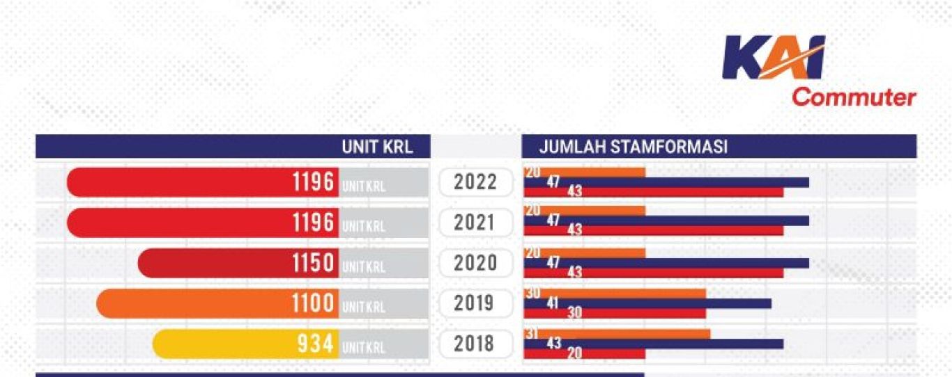 Dari 1.196 unit KRL yang dimiliki, KAI Commuter setiap harinya menyiapkan 94 rangkaian untuk melayani pengguna dan tiga rangkaian cadangan. KRL yang dimiliki KAI Commuter dibagi dalam tiga jenis stamformasi (SF) kereta yaitu rangkaian yang terdiri dari 8 kereta, 10 kereta, dan 12 kereta. KAI Commuter saat ini memaksimalkan kapasitas angkut menggunakan 43 rangkaian dengan SF 12, 47 rangkaian dengan SF 10, dan 20 rangkaian dengan SF 8.