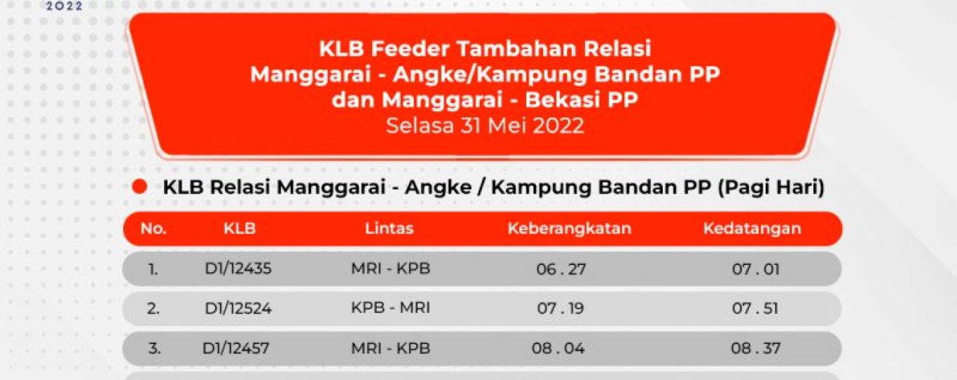 Selain itu, untuk melayani pengguna yang transit di Stasiun Manggarai untuk menuju Bekasi/CIkarang pada sore hari KAI Commuter akan menjalankan KRL Feeder relasi Manggarai-Bekasi PP sebanyak enam perjalanan. Berikut jadwal KRL Feeder pada sore hari: