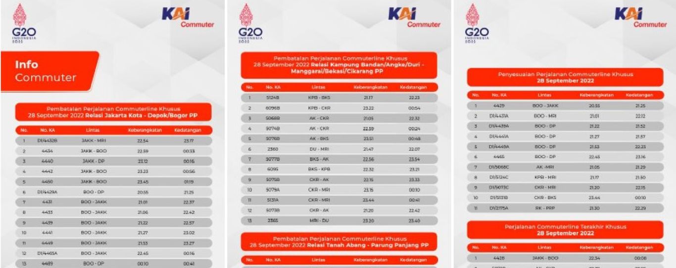 KAI Commuter mengimbau para pengguna yang hendak menggunakan commuterline khusus pada Rabu 28 September 2022, untuk menyesuaikan kembali keberangkatannya khusus pada malam hari dikarenakan adanya pengaturan rekayasa pola operasi perjalanan commuterline dengan jadwal-jadwal tersebut. Informasi lebih lanjut seputar perjalanan commuterline dapat diakses melalui aplikasi KRL Access akun media sosial @commuterline serta call center 021-121.