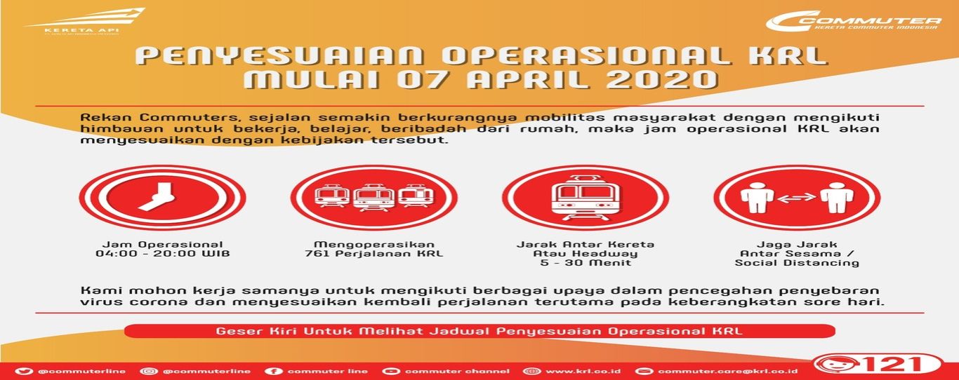 Layanan KRL Commuter Line akan mengikuti perkembangan situasi terakhir dan kebijakan yang ditentukan oleh pemerintah. Rencana perubahan operasional dan layanan KRL selanjutnya akan tetap disampaikan melalui website www.krl.co.id dan akun sosial media resmi perusahaan di @commuterline.