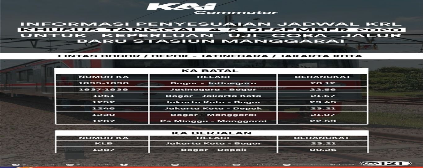 KAI Commuter akan memberlakukan penyesuaian jadwal KRL khusus tanggal 4 – 6 Desember 2020. Penyesuaian jadwal pada tiga hari tersebut guna mendukung uji coba jalur baru di Stasiun Manggarai sebagai bagian dari pembangunan stasiun dan jalur dwi ganda (double – double track) Manggarai – Bekasi.