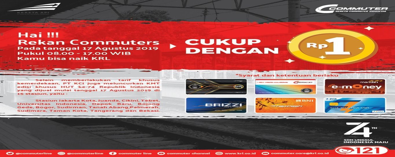 Pada peringatan HUT ke-74 Republik Indonesia 17 Agustus 2019 ini, masyarakat dapat kembali menggunakan layanan KRL Commuter Line dengan tarif yang sangat terjangkau. Cukup dengan Rp1 masyarakat dapat menggunakan layanan KRL Commuter Line ke seluruh tujuan.